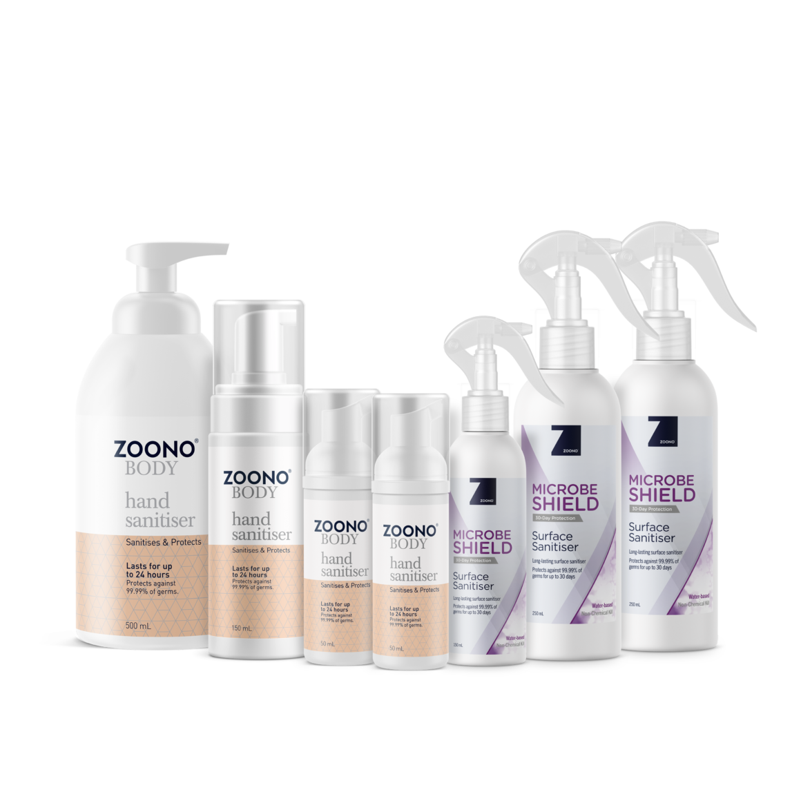 Uz samo jedno nanošenje na kožu ZOONO proizvodi omogućavaju dugotrajnu zaštitu: do 24-satnu zaštitu kože uz proizvode ZOONO Hand sanitiser (spray 100 ml, pjena 100 ml) i čak do 30 dana zaštite površina od rekontaminacije uz primjenu ZOONO Microbe Shield All-purpose (spray 30 ml, 250 ml, 1000 ml) pa predstavlja idealnog saveznika u borbi protiv mikroba koji pruža dodatnu sigurnost u borbi protiv uzročnika zaraznih bolesti.
