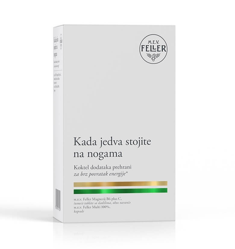 M.E.V. Feller® Kada jedva stojite na nogama je koktel dodataka prehrani za brz povratak energije. Sadrži M.E.V. Feller® Magnezij B6 plus C šumeće tablete s okusom naranče i M.E.V. Feller® Multi 100% kapsule koje su izvor esencijalnih vitamina i minerala. M.E.V. Feller® Magnezij B6 plus C šumeće su tablete s okusom naranče koje sadržavaju magnezij, vitamin B6 i C. Oni pridonose normalnom funkcioniranju živčanog sustava, smanjenju umora i iscrpljenosti te normalnome metabolizmu stvaranja energije. Magnezij pridonosi ravnoteži elektrolita i normalnoj funkciji mišića.