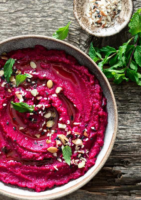 Slanutak, ciklu, češnjak, tahini, ulje i sok od limuna ubacite u multipraktik ili blender s prstohvatom soli. Usitnjavajte sastojke dok ne dobijete glatku smjesu – dodajte još soli ili limuna ako je potrebno. Servirajte s povrćem, sirovim ili pečenim i kapljicom maslinova ulja za ukras.