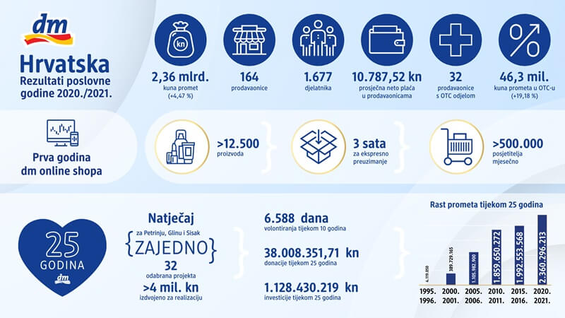 U četvrtak, 11. studenog, članovi Uprave dm-a predstavili su rezultate poslovne godine 2020./2021.[1] u kojoj je promet dosegnuo 2,36 milijardi kuna i time nadmašio prošlogodišnji za 4,47 %. Pozitivan razvoj poslovanja nastavljen je i u segmentu bezreceptnih medicinskih proizvoda u kojem je ostvaren rast od 19,18 %.