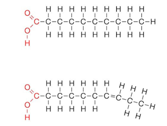 Struktura zasićenih i nezasićenih prehrambenih masti (karboksilna skupina označena crvenom bojom):