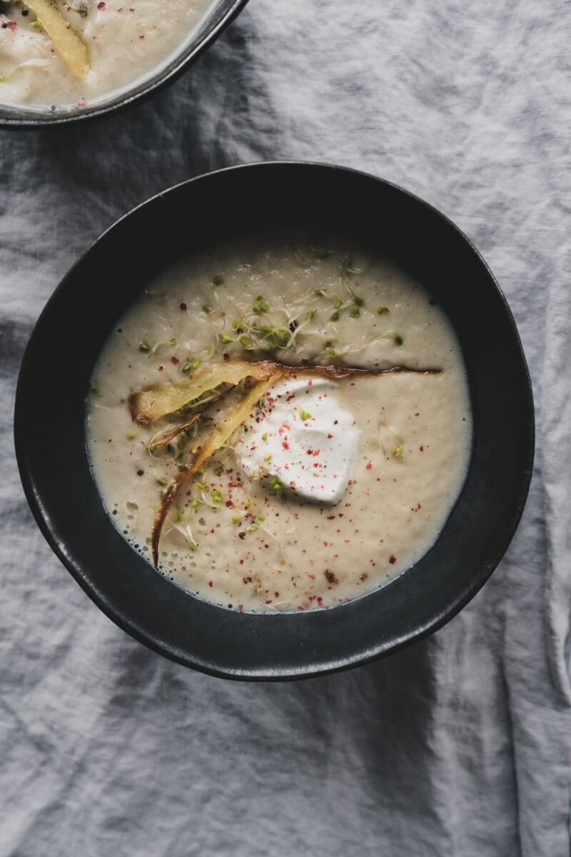 Kada je juha gotova, prebacite je u blender, dodajte 1 žlicu grčkog jogurta i senf te sve miksajte dok smjesa ne postane glatka. Podijelite je u dvije zdjele, svakoj dodajte žličicu grčkog jogurta, papar, klice te čips. Po potrebi dodajte još malo soli. Dobar tek!