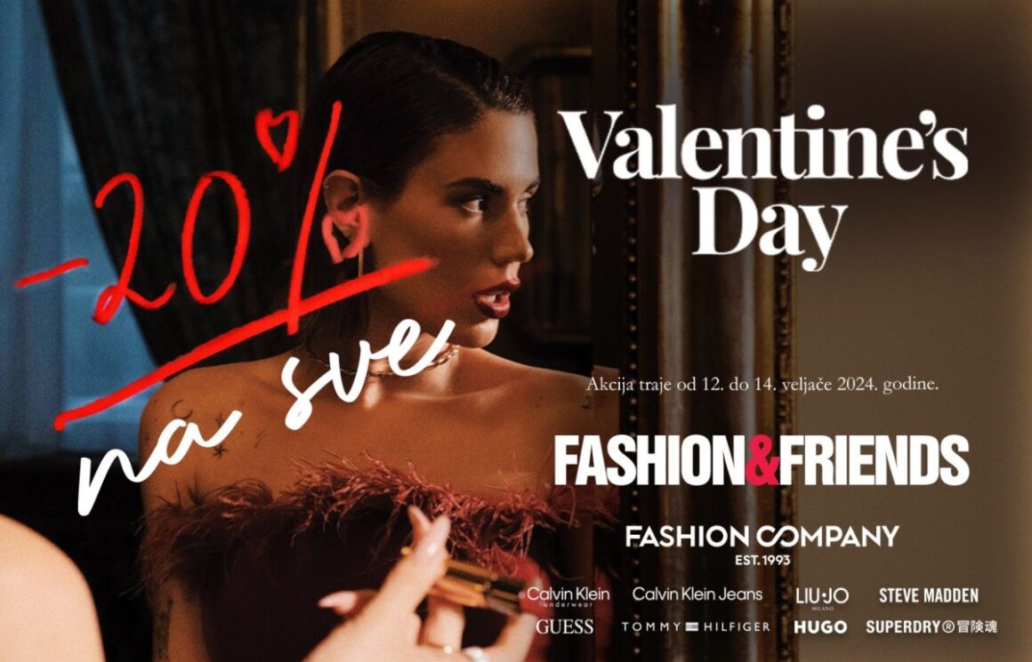 Tako ćete na posebnoj valentinovskoj akciji na 20% popusta moći uloviti tražene komade iz nove kolekcije, ili ukoliko se odlučite na komade koji su već sniženi, FASHION&FRIENDS i FASHION COMPANY trgovine daruju dodatnih 20% popusta na već snižene artikle.