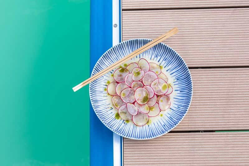 File orade izrežite oštrim nožem na ploške debljine 5 mm. Stavite ribu u posudu i marinirajte s Leche de Tigre. Jabuku narežite na kockice. Stavite ribu s marinadom na tanjur