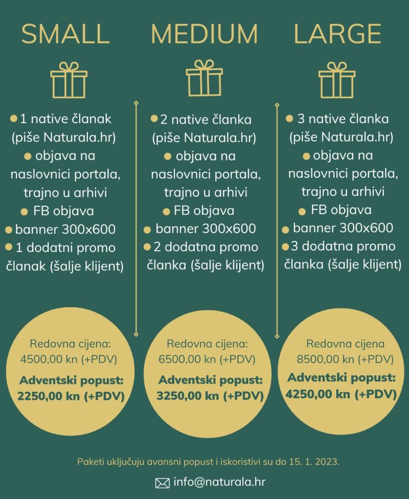 Advent je stigao i na portal Naturala.hr! Želimo vam uspješno i rastuće poslovanje u 2023. godini, a kako bismo vam to olakšali, pripremili smo za vas tri povoljna oglašivačka paketa! Predstavite svoj proizvod ili uslugu i prepustite se u ruke timu profesionalaca koji će to učiniti putem zanimljivih native članaka.