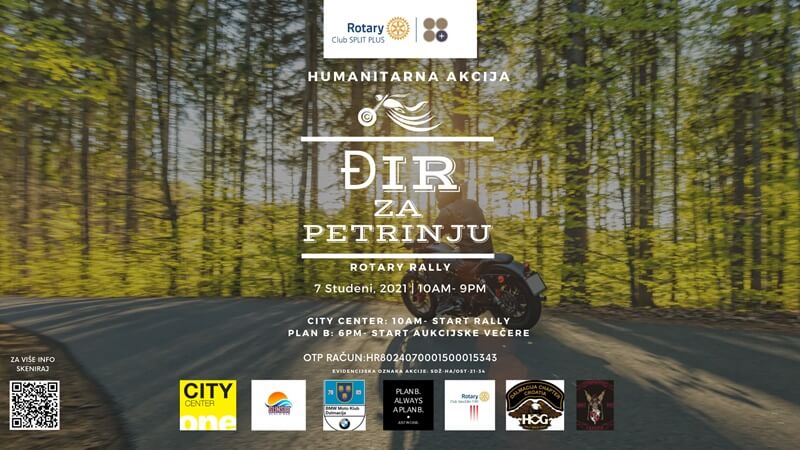 Poštovani prijatelji, partneri i ljudi velikoga srca, uskoro će biti godina dana od razornog potresa na području Banije, a brojne obitelji i danas žive u jako teškim uvjetima, u neadekvatnim kamp kućicama a kuće im nisu obnovljene. Zato smo mi u Rotary Clubu Split Plus odlučili pokrenuti humanitarnu akciju (Rotary Rally) pod nazivom ĐIR ZA PETRINJU koja traje do 15. prosinca 2021. godine s ciljem da se pomoć Baniji ne zaboravi i da pomognemo u obnovi kuća za pet obitelji čiji su domovi stradali u potresu krajem prošle godine.