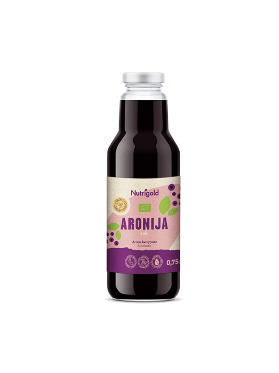 Aronija je mala, tamna bobica iz porodice ruže (Rosaceae) s brojnim blagotvornim svojstvima. Ima sjajne energetske vrijednosti i vrlo nizak udio masti i zasićenih masnih kiselina. Nutrigold sok od aronije je EKO proizvod dobiven od 100% čiste hrvatske aronije, bez dodanog šećera, vode i konzervansa, proizveden pod strogim uvjetima proizvodnje.