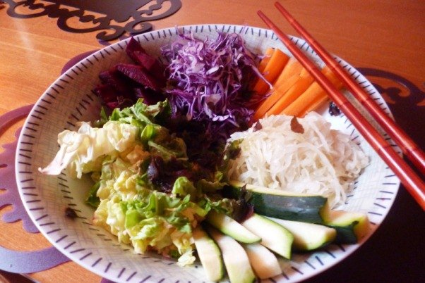Jeste li znali da su čak Kinezi koji su gradili veliki Kineski zid jeli kiseli kupus prije 2 tisuće godina? I rimski legionari su sa sobom u daleke bitke nosili čitave glavice kiselog kupusa. Pa što onda vi čekate? varijanta tri: opet kiseli kupus s raznim povrćem, ovaj put sam dodala i malo crvenog kupusa te začinila orijentalnim preljevom pa da sve bude u stilu, jela sam štapićima.