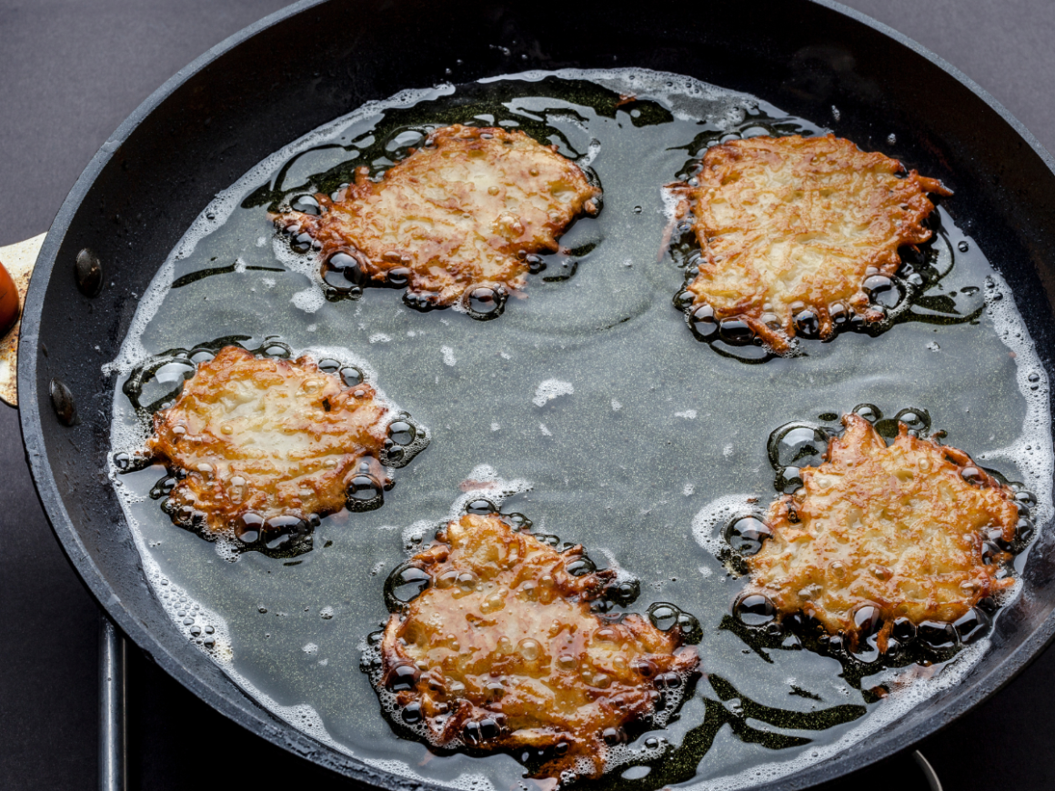 U velikoj tavi s debelim dnom na srednje jakoj vatri zagrijte 1 veliku žlicu ulja i 1 veliku žlicu maslaca – pazite, ne bi se trebali početi dimiti! Ubacite u tavu nešto manje od četvrtine šalice smjese krumpira i oblikujte palačinku. Pržite više palačinki odjednom, samo pazite da se ne dodiruju – vjerojatno će vam u tavu stati 3 do 4 palačinke odjednom.