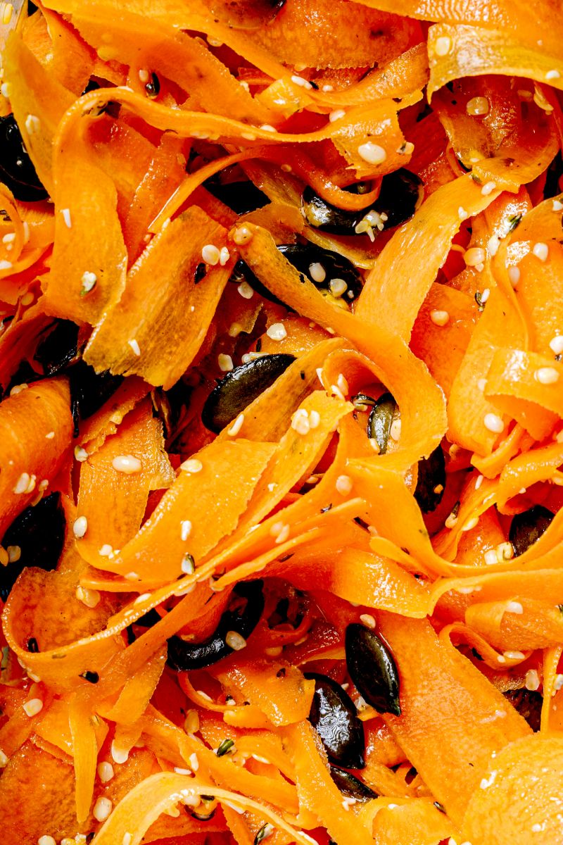 - Mrkvu oguli, a zatim je pomoću guljača nareži na tanke trake. Tako će dodati i teksturu i vizualnu eleganciju.