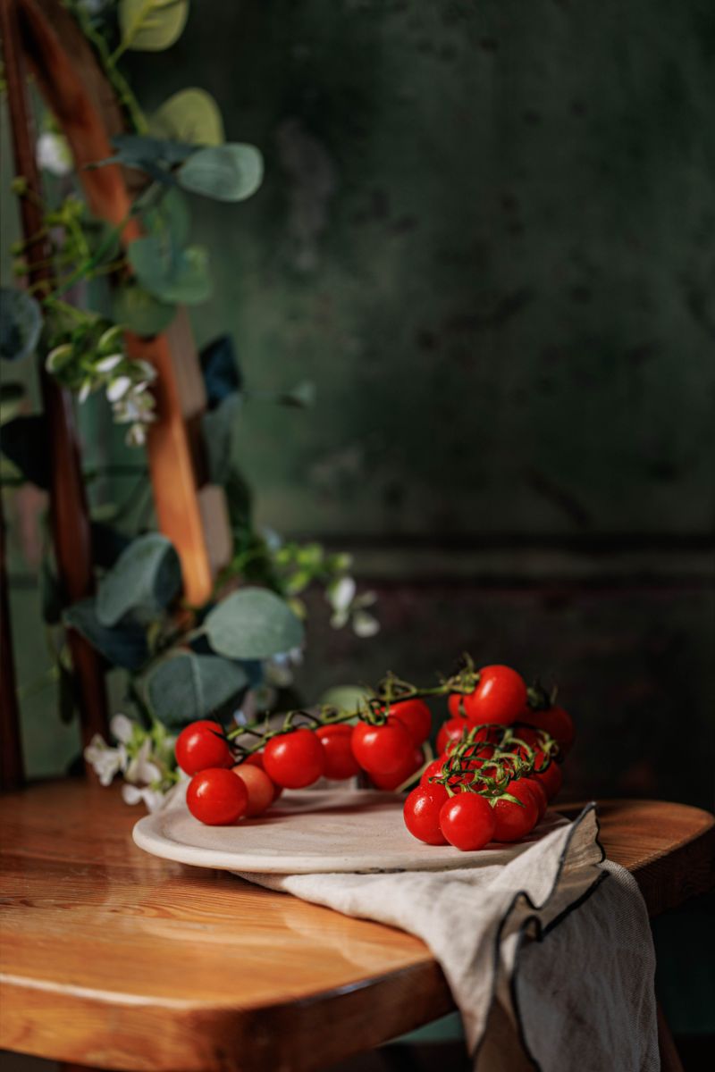 Zanimljivo je kako malo toga treba da scena ispriča puno. Drvena stolica, tamno zelena pozadina, lišće u kutu. Sve je pažljivo složeno, ali ne prenapadno. Ništa ne viče. Sve šapuće. Upravo zato ruka i hrana dolaze do izražaja. Minimalistički pristup u food fotografiji nije “manje”, nego je poziv da “vidimo više”. Više nijansi, više tekstura, više emocija. Ovdje nema gomile rekvizita. Ima prostora da jelo diše, da gledatelj uđe u scenu.
