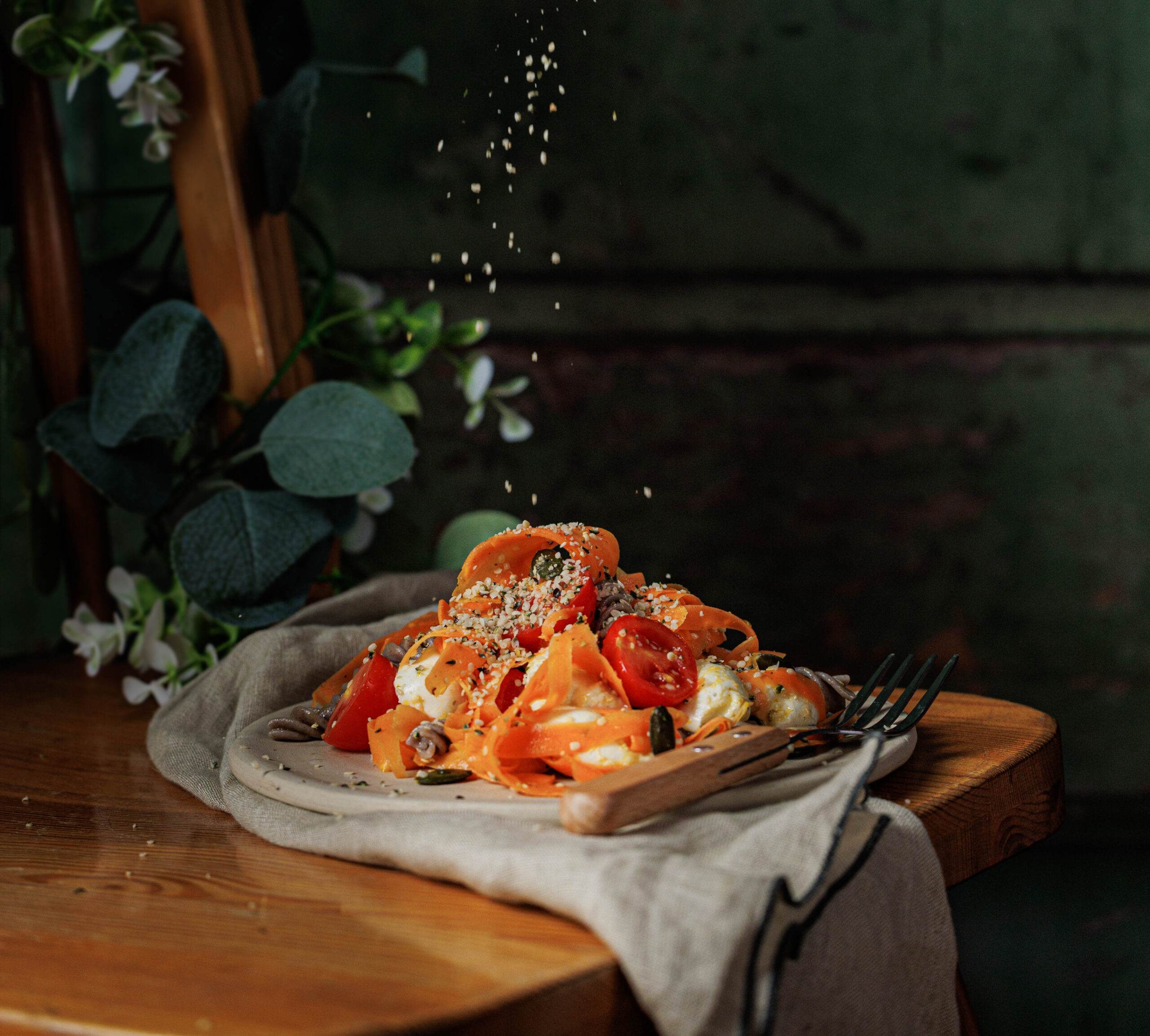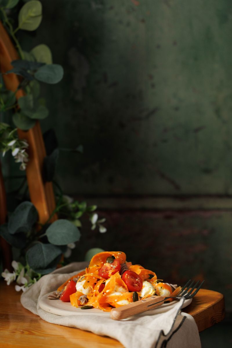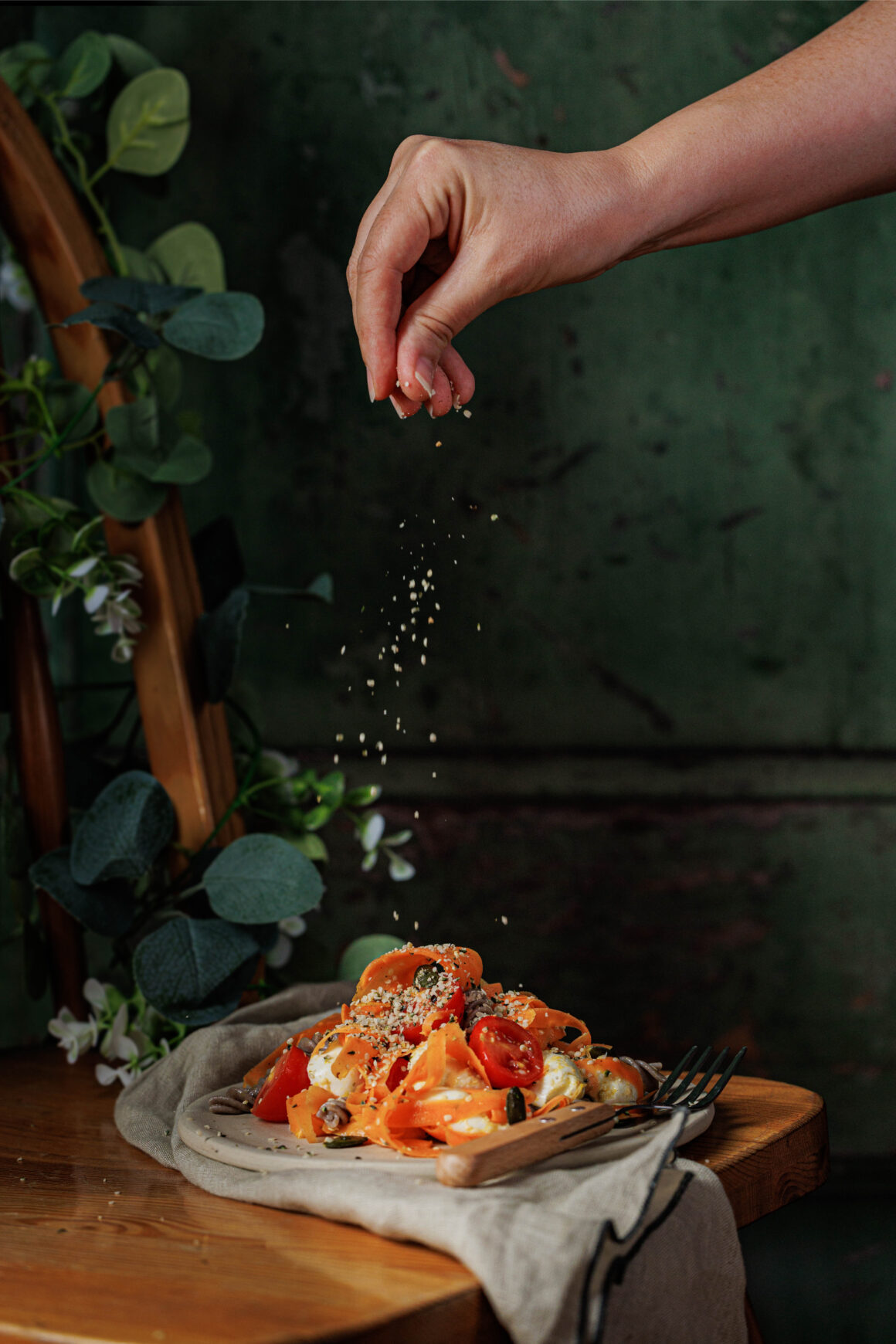 Ova fotografija je upravo to. Na prvi pogled, vidimo tanjur salate od svježih sastojaka: tanke trakice mrkve, rajčice, sjemenke, fusile. Svjetlo je meko, toplo, a scena djeluje kao da smo na trenutak sjeli za stol u nekom kutku prirode. Ali ono što ovu fotografiju uzdiže iznad puke dokumentacije jela jest ljudski element.