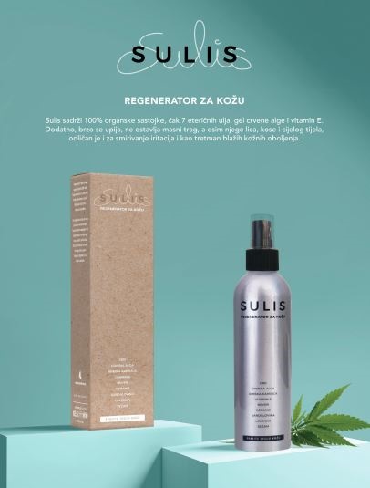 Ono što je osobito zanimljivo jest to da je baza hidratantne vodice CBD ulje, odnosno ulje konoplje, koje se pokazalo kao ljekovito sredstvo u liječenju i prevenciji raznih težih i lakših bolesti. Tako je nastao Sulis – regenerator za kožu koji sadrži 100% organske sastojke, čak 7 eteričnih ulja, gel crvene alge i vitamin E. Svojim sastojcima ne masti kožu, ima protuupalno djelovanje, odličan je za smirivanje iritacija, crvenila, blažih kožnih oboljenja i nije testiran na životinjama.