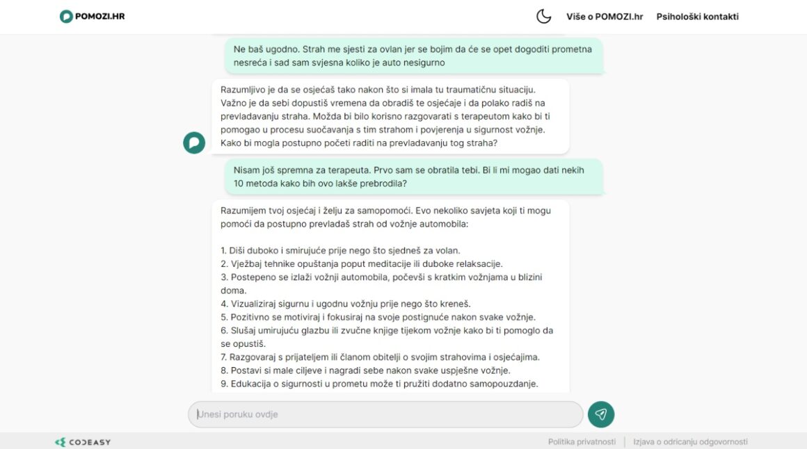 “Do sada smo našim klijentima implementirali umjetnu inteligenciju u njihova poslovanja, međutim, htjeli smo nešto na poklon dati i zajednici. Nešto što bi potencijalno moglo smanjiti broj nesretnih slučajeva, a ujedno i pomoći svakoj osobi kojoj je podrška i psihološka pomoć potrebna. Na platformi još radimo i naravno da ona nije savršena, no trudimo se da svakim danom bude što bolja. Stalno apostrofiramo i da ona nije zamjena za stručnu pomoć, stoga se u komunikaciji često pruža smjernica prema stručnjacima, dok smo za krizne situacije postavili i hitne brojeve telefona te nazive institucija kojima se osobe mogu obratiti”, rekao nam je autor platforme i direktor tvrtke Codeasy, Ivan Biliškov.