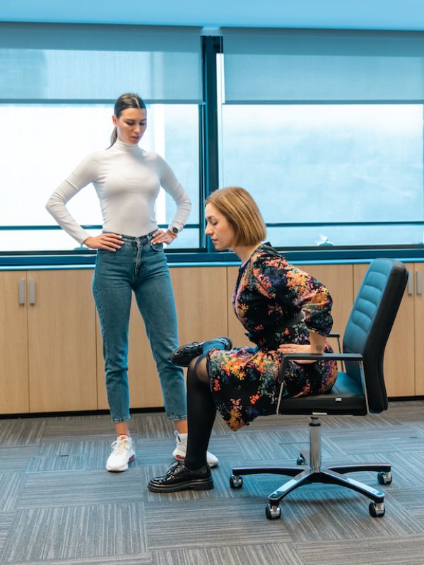 Zauzmite raskoračni stav, noge u širini ramena, predručenje. Spuštate se u čučanj do ruba stolice i vratite u početnu poziciju. Vježba dominantno aktivira mišića nogu, ali tijekom izvedbe nam je aktivno cijelo tijelo. 10 ponavljanja, 2 serije.