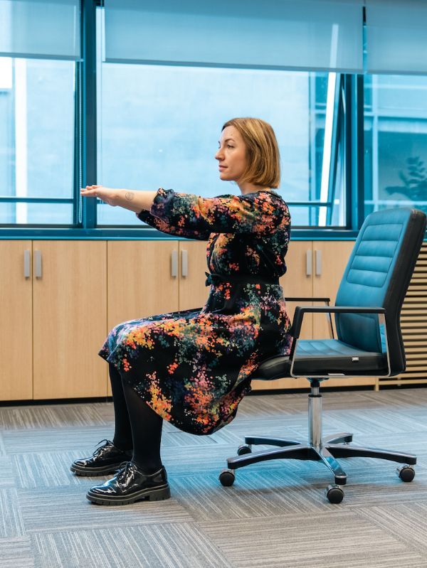 Sjednite na rub stolice, aktivirajte mišice trupa i ispravite leđa, a ruke stavite na bokove. Zatim stopalo desne noge naslonite na natkoljenicu lijeve noge ili obratno. Aktivnim gornjim dijelom tijela idete u pretklon. Pokret je iz zglobova kukova. Vratite se u početni položaj. Služi za istezanje mišića stražnjice. 10 ponavljanja svakom nogom, 2 serije.