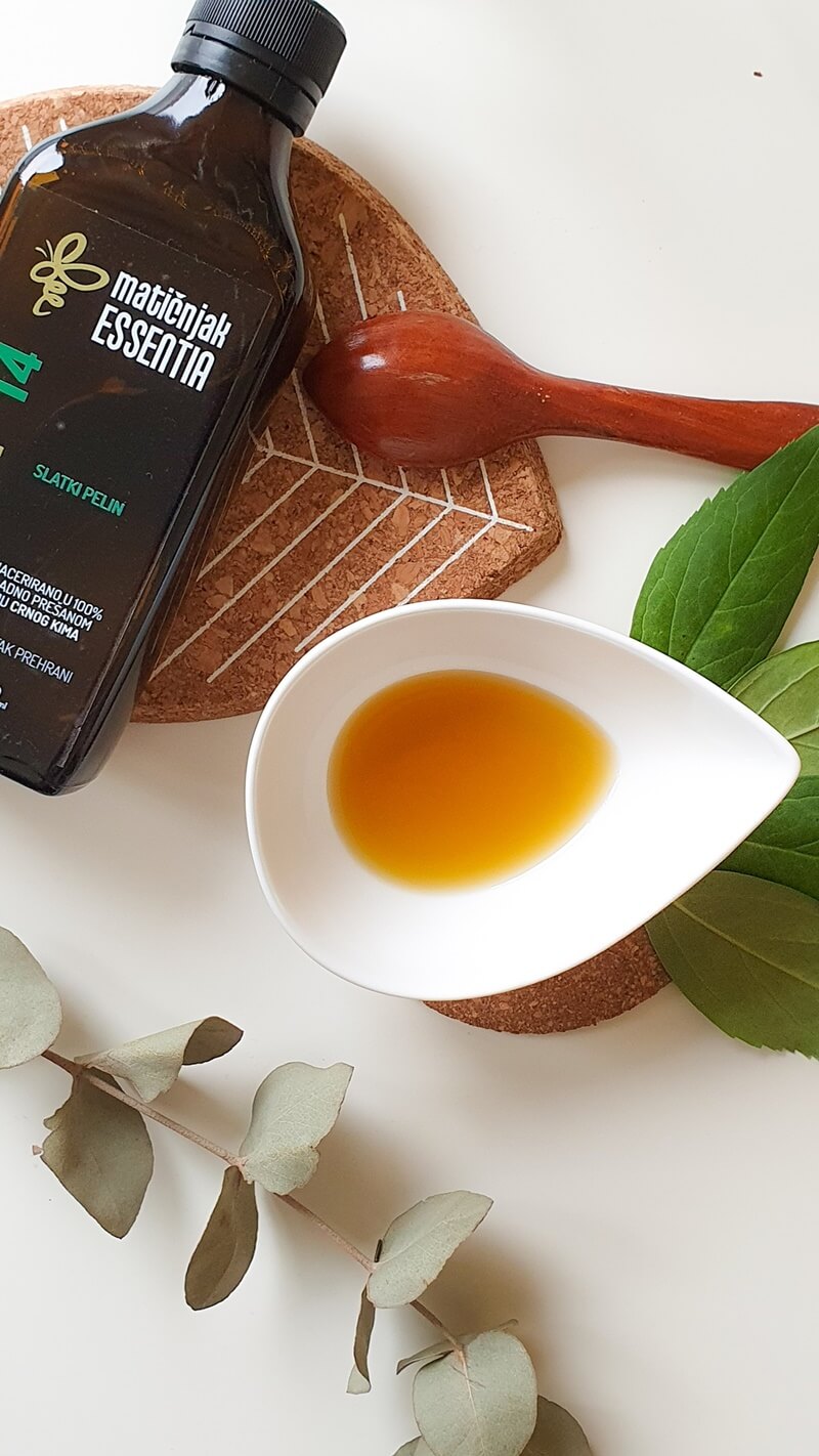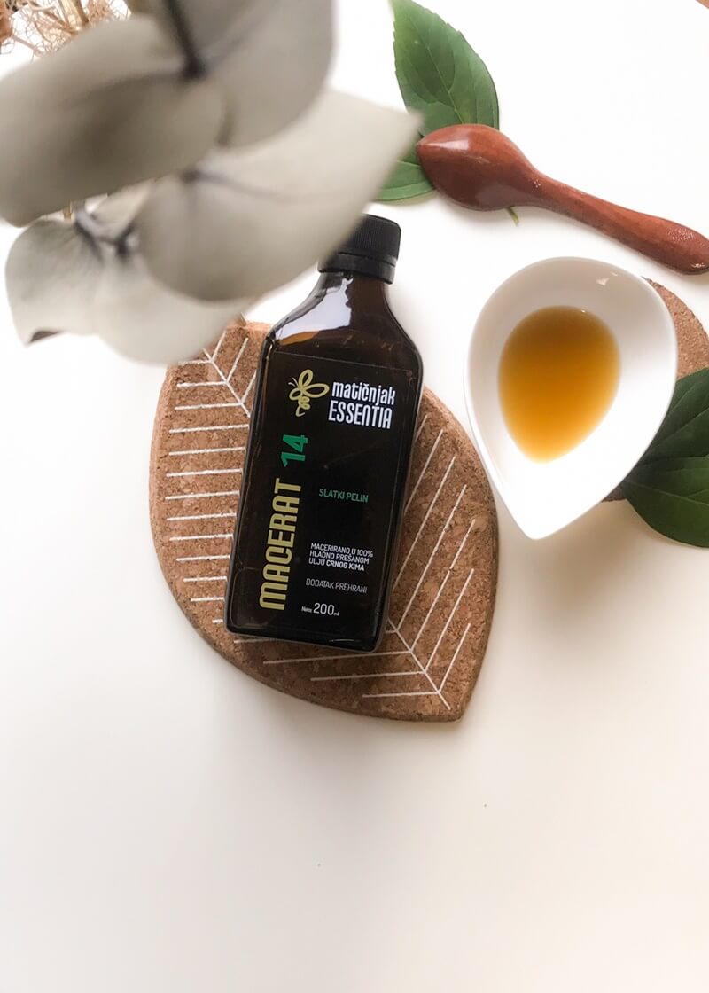 Hrvatski proizvođač ‘Matičnjak’ u svojoj ponudi imaju uljni macerat slatkog pelina. Napravljen od 100% hladno prešanog ulja crnog kima čijim svakodnevnim uzimanjem definitivno možete zaštiti svoj imunitet. Dokazano djeluje kao vrlo jak saveznik u borbi protiv virusa, bakterija i infekcija. Macerat slatkog pelina iz Matičnjaka u hladno prešanom ulju crnog kima, predstavlja sinergiju dvije biljke koje su između ostalog jaki imunomodulatori pa se koriste i u borbi protiv najtežih bolesti. Već sam macerator, ulje crnog kima povećava aktivnost te količinu tzv. T – limfocita i NK stanica koje čine prirodni obrambeni sustav u borbi protiv virusa i bakterija. Slatki pelin djeluje također protuupalno, antibakterijski, antigljivično, regulira imunitet, pomaže kod probave, liječi od parazita te pomaže i kod kožnih bolesti. Jako je efektan kod regulacije imuniteta, pa ga je zato dobro koristiti i preventivno.