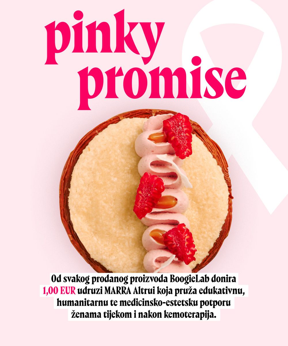Udruga Marra Altrui svoj je rad posvetila pružanju podrške ženama koje se hrabro bore s rakom dojke, a u suradnji s Boogie Labom, osmislila je način na koji svi mogu pomoći i pritom se zasladiti. Inovacija najpoznatije zagrebačke artisan pekarnice pod nazivom Pinky Promise desert je s humanitarnom misijom, a zadovoljit će i najzahtjevnija nepca. Naime, riječ je slastici od lisnatog tijesta s keksom od kokosa, punjenoj džemom od maline i karamelom od kokosa.