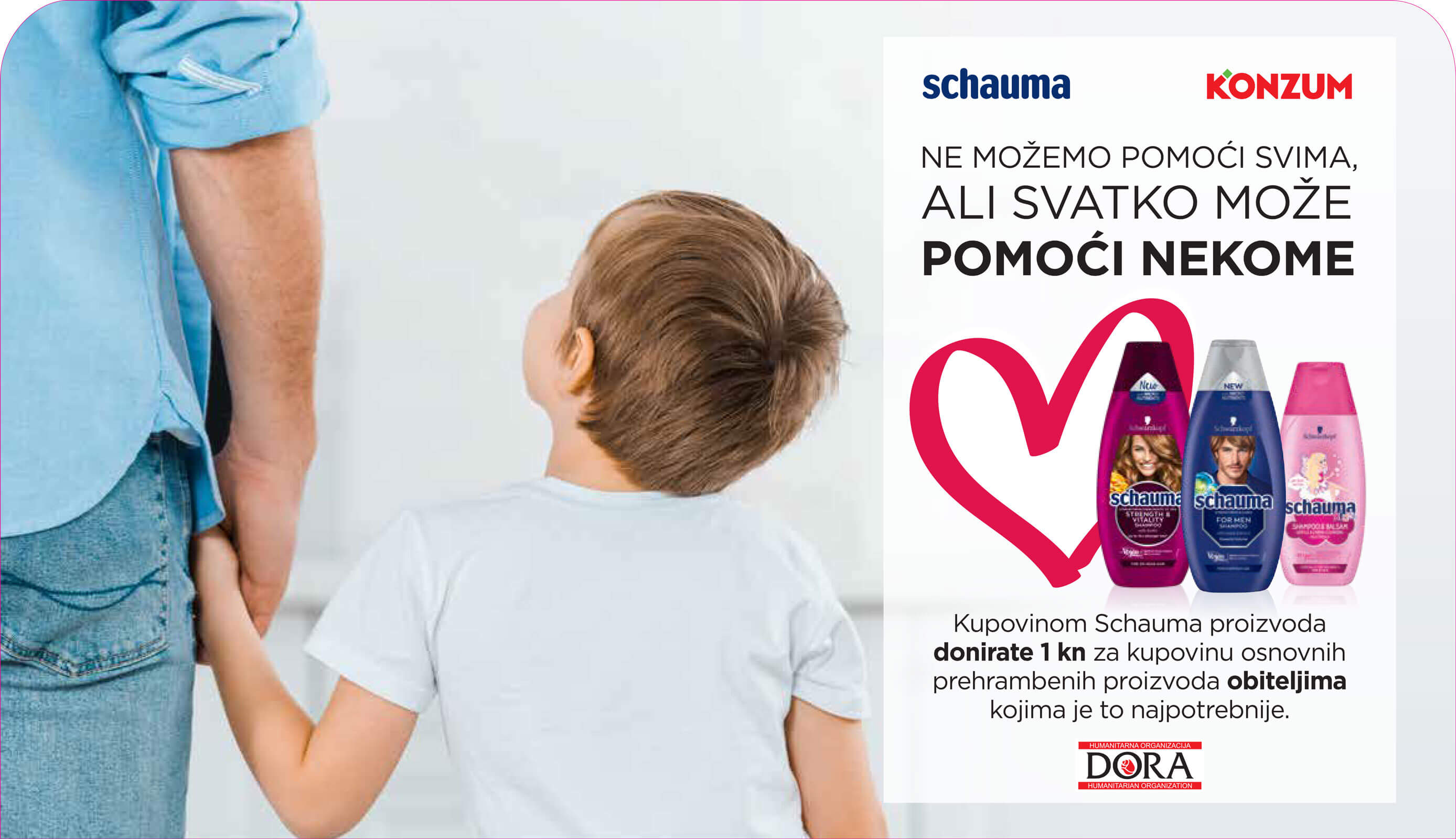 U razdoblju od 1. rujna do 31. listopada, kupovinom Schauma proizvoda u Konzum prodavaonicama, donirate jednu kunu za kupovinu osnovnih prehrambenih proizvoda obiteljima kojima je to najpotrebnije. Ususret danu koji poziva na podršku i pomoć slabijima, zajedničkim snagama će svoj doprinos ovom plemenitom cilju dati organizatori akcije: Schauma i Konzum.