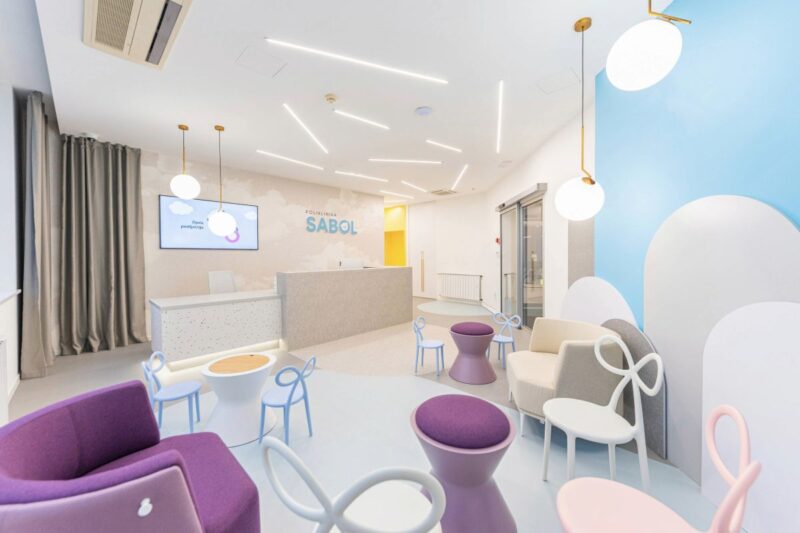 Interijer pedijatrijske Poliklinike Sabol u Folnegovićevoj ulici osmišljen je kao igraonica s interaktivnim elementima te istovremeno praktičan i multifunkcionalni prostor u kojemu su svaki materijal, rasvjetna tijela i boja odabrani kako bi smanjili stres dolaska i povećali produktivnost obrade pacijenata. Projektirao ga je i opremio po jedinstvenom Design+Build modelu domaći DC&T, specijaliziran za dizajn poslovnih prostora i zdravstvenih ustanova.