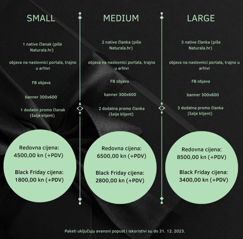 Stiže nam Black Friday zbog kojega smo cijene oglašavanja na portalu Naturala.hr snizili za čak 70 % te za vas pripremili tri super povoljna oglašivačka paketa – small, medium i large.