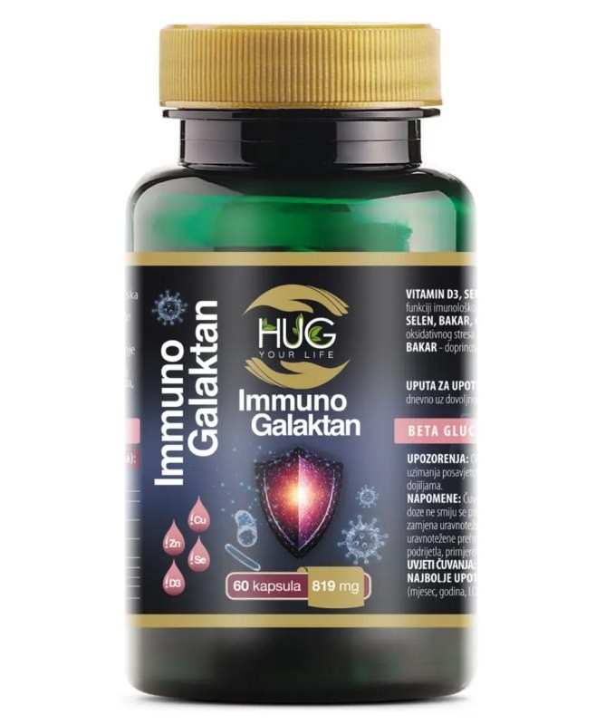 ImmunoGalaktan novi je proizvod hrvatskog proizvođača dodataka prehrani Hug Your Life. Donosi nam standardizirane, prirodne i vrijedne sastojke u visokim dnevnim dozama. Sastoji se od 5 biljnih ekstrakata u sinergiji s mineralima i vitaminima koji zajedničkim djelovanjem doprinose normalnoj funkciji imunološkog sustava, zaštiti stanica od oksidativnog stresa i normalnom metabolizmu stvaranja energije.