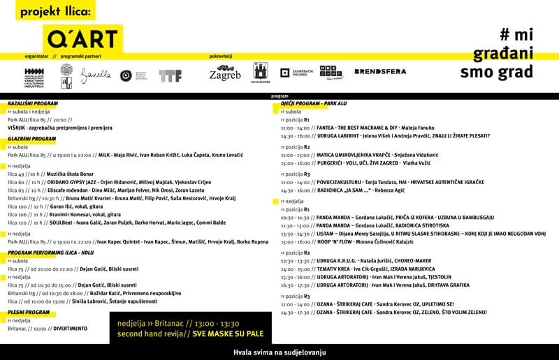 Projekt Ilica: Q’Art ponovo će oživjeti Ilicu i u svom rujanskom izdanju. Uz partnere projekta: kazalište Gavella, Akademiju likovnih umjetnosti i HDLU građane želi privući u samo ranjeno srce grada, kako bi, unatoč svim krizama i nedaćama koje su snašle grad i njegove ljude, pokazao da zajednica živi i kad je najteže i potaknuo ljude na solidarnost, ali i na promišljanje i aktivaciju u smjeru boljeg i kvalitetnijeg života u Zagrebu.
