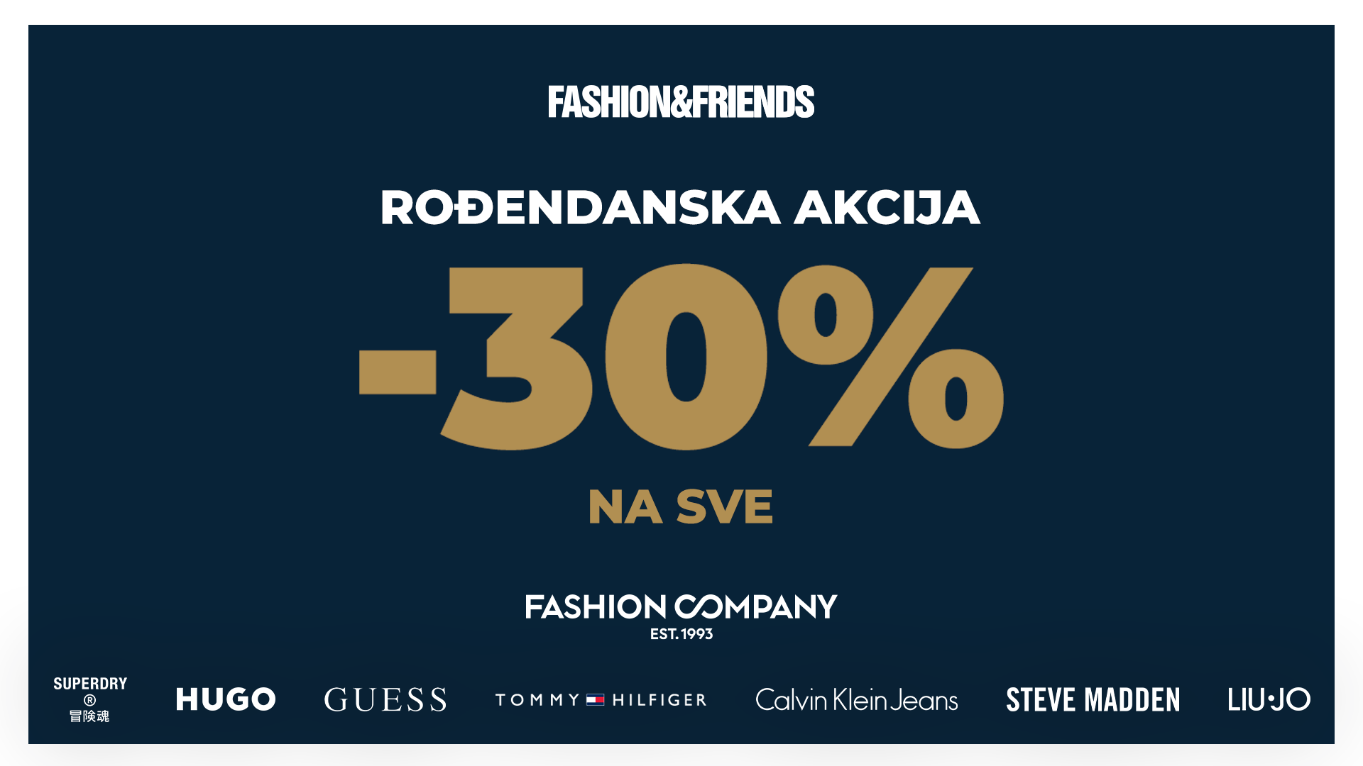 Modni klasici za svaki dan, trendi komadi za posebne prilike i statement dodaci koji definiraju sezonu – sve vas čeka s rođendanskih 30% popusta. Bilo da shoppingirate za sebe ili birate poklon koji će oduševiti – ovaj petak rezerviran je za stil. Jednostavno, a efektno, definicija je stila koji priželjkuju mnoge pripadnice nježnije spola ali i muškarci, a upravo vodeći svjetski modni brendovi poput Tommy Hilfiger, Calvin Klein, Guess, Liu Jo, Steve Madden, HUGO i Superdry kao i najpoznatiji multi brand koncept Fashion&Friends imaju idealne komade uz koje nećete proći nezapaženo.