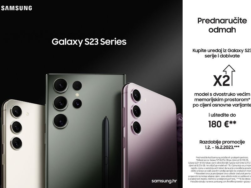 Pametni telefoni iz Galaxy S23 serije dostupni su i u posebnom periodu prednarudžbe, gdje uz kupnju jednog od uređaja dobivate model s dvostruko većim memorijskim prostorom po cijeni osnovne varijante, čime se može ostvariti značajna ušteda. Vrijeme prednarudžbe traje od 1. do 16. veljače ili do isteka zaliha, a više informacija potražite na linku.