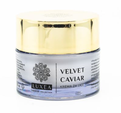 I vaša koža je zaslužila uživanje u ekskluzivnoj blagdanskoj trpezi. Zašto je ne biste nahranili – kavijarom? Velvet Caviar krema za lice sadrži ekstrakt kavijara s preko 26 vitamina, aminokiselina i ostalih nutrijenata te je prikladna za sve tipove kože. Ova vrhunska krema za dubinsku njegu i hidrataciju lica predstavlja posljednji korak u njezi kože lica, hrani je, štiti od okolišnih čimbenika i preuranjenog starenja te joj daje baršunastu mekoću. Također sadrži koloidno zlato koje dodatno naglašava osjećaj luksuza na vašoj koži.