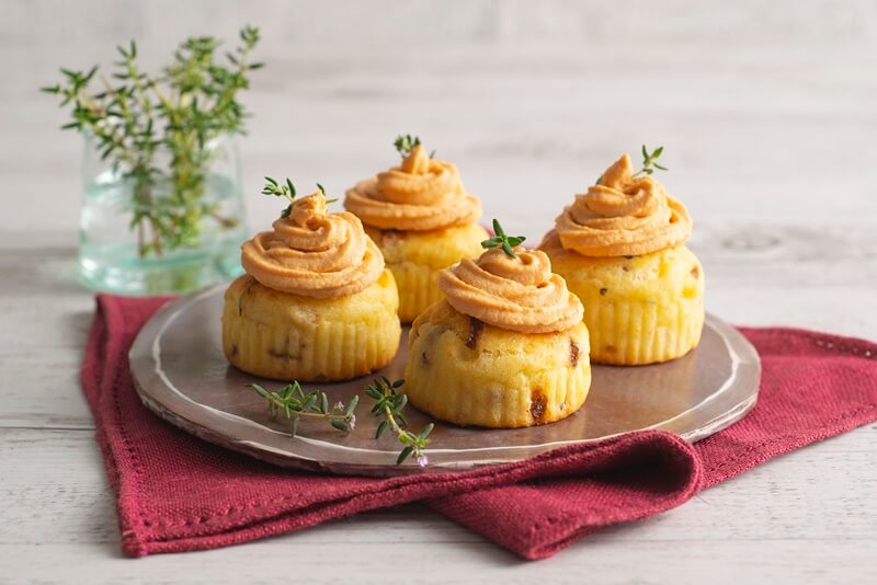 Narežite luk, popržite ga u tavi na maslinovom ulju i dodajte malo soli i timijana. Zatim izmutite jaje električnim mikserom i dodajte mlijeko, brašno, kvasac i parmezan te nastavite miješati još minutu. Dodajte sol, maslinovo ulje i prženi luk. Nakon toga smjesu rasporedite u 12 nauljenih i pobrašnjenih silikonskih kalupa i pecite 12 minuta u pećnici zagrijanoj na 180° ili dok muffini ne nabubre i ne porumene. Potom ostavite muffine da se ohlade, izvadite ih iz kalupa te nadjenite debelim slojem Rio Mare Paté namaza od lososa i poslužite. U slast!