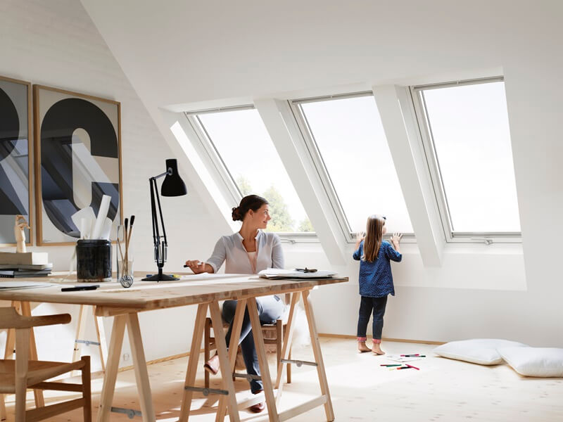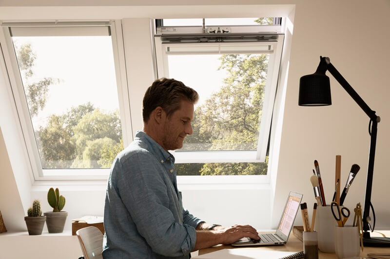 Ugradnjom VELUX krovnog prozora svaki kutak vašeg potkrovlja možete pretvoriti u privlačan i ugodan radni prostor. Za funkcionalan ured nije presudna veličina prostora već dovoljno dnevne svjetlosti i svježeg zraka. Zdravija unutarnja klima prostora osigurati će vašim očima, umu i tijelu odlične uvjete za uspješan radni dan pred računalom.