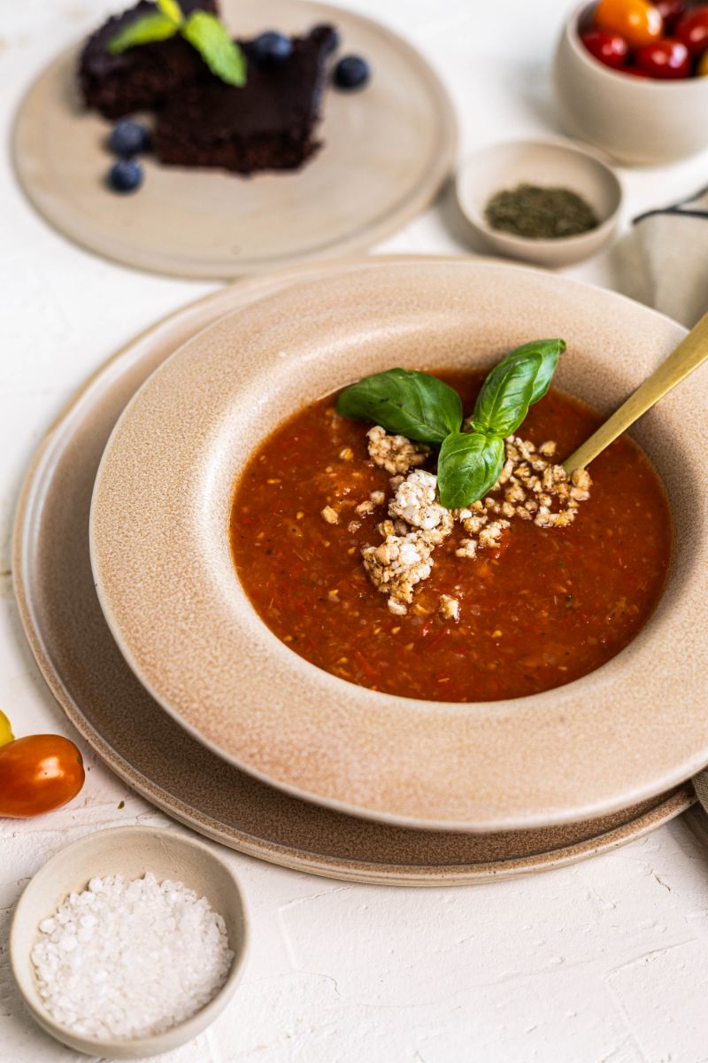 Tako je Viktorija svojim čarobnim rukama napravila tanjure i zdjelice koje savršeno pašu uz odabrani menu – juhicu od rajčice i brownie bez brašna, pa krenimo s analizom: