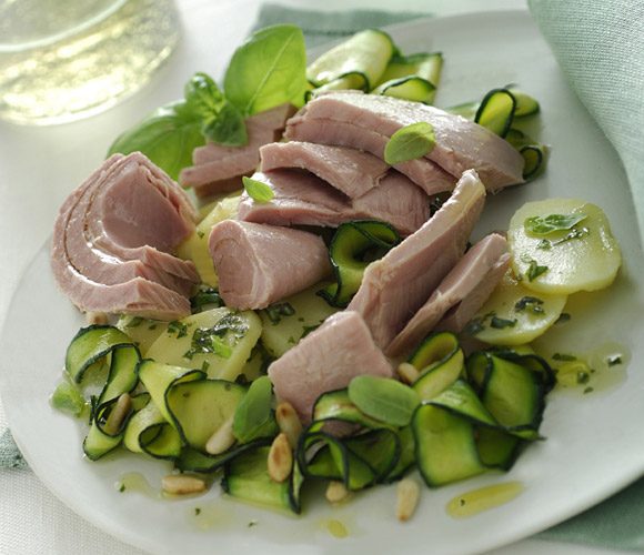 3. Posložite krumpir na tanjur, na njega stavite tunjevinu, dodajte tikvice začinjene s malo umaka od bosiljka i pinjole te na kraju sve prelijte ostatkom umaka od bosiljka. Još ukusnije sa šakom maslina Taggiasche bez koštice.